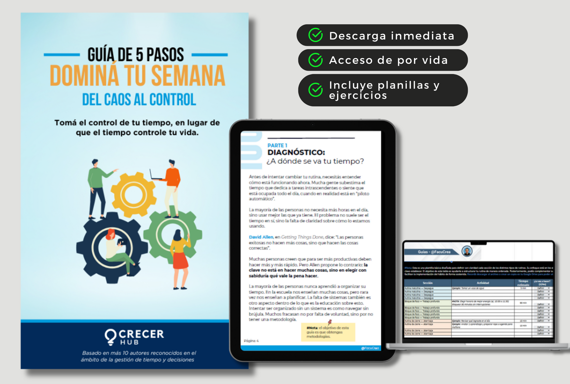 Esta guía es un recurso práctico de productividad y organización personal, pensado para personas que sienten que no les alcanza el tiempo, terminan la semana con frustración o desean tomar el control de su rutina. Es ideal para profesionales, estudiantes, emprendedores y personas con agendas exigentes. Todo el contenido que encontrarás en la guía está basado en el trabajo de más de diez autores reconocidos internacionalmente y por los métodos de gestión del tiempo más valorados en el ámbito profesional.